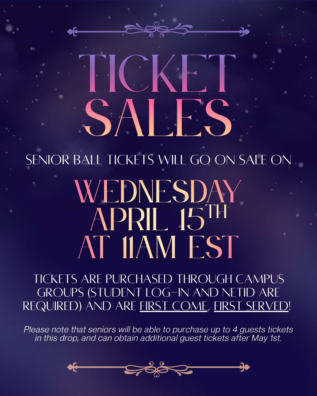 Tickets will be released for purchase by seniors on April 15th at 11AM. Information will be sent via email and available on Instagram and Facebook! View FAQ below.