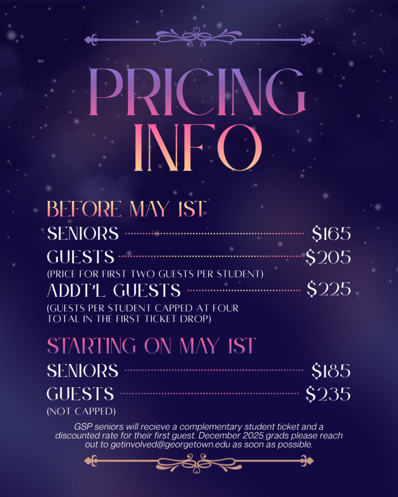 We are INCREDIBLY excited to announce “Under Twilight Skies” as the theme for this year’s Senior Ball on May 15th, 2026 at Union Station. From dusk to dawn, get ready to celebrate Georgetown’s Class of 2026 with a night of magic and memories! All graduating seniors and their families are invited to attend.